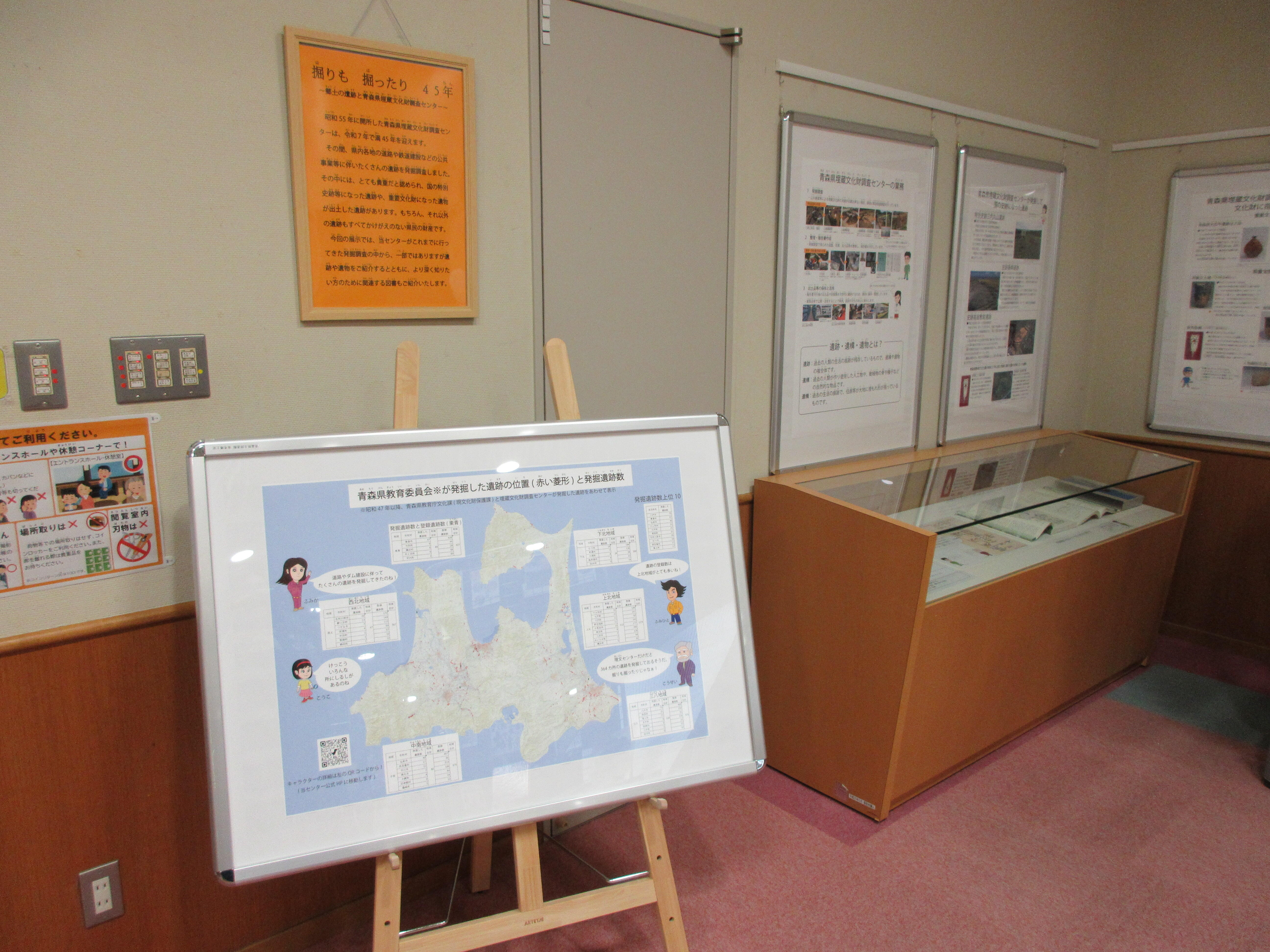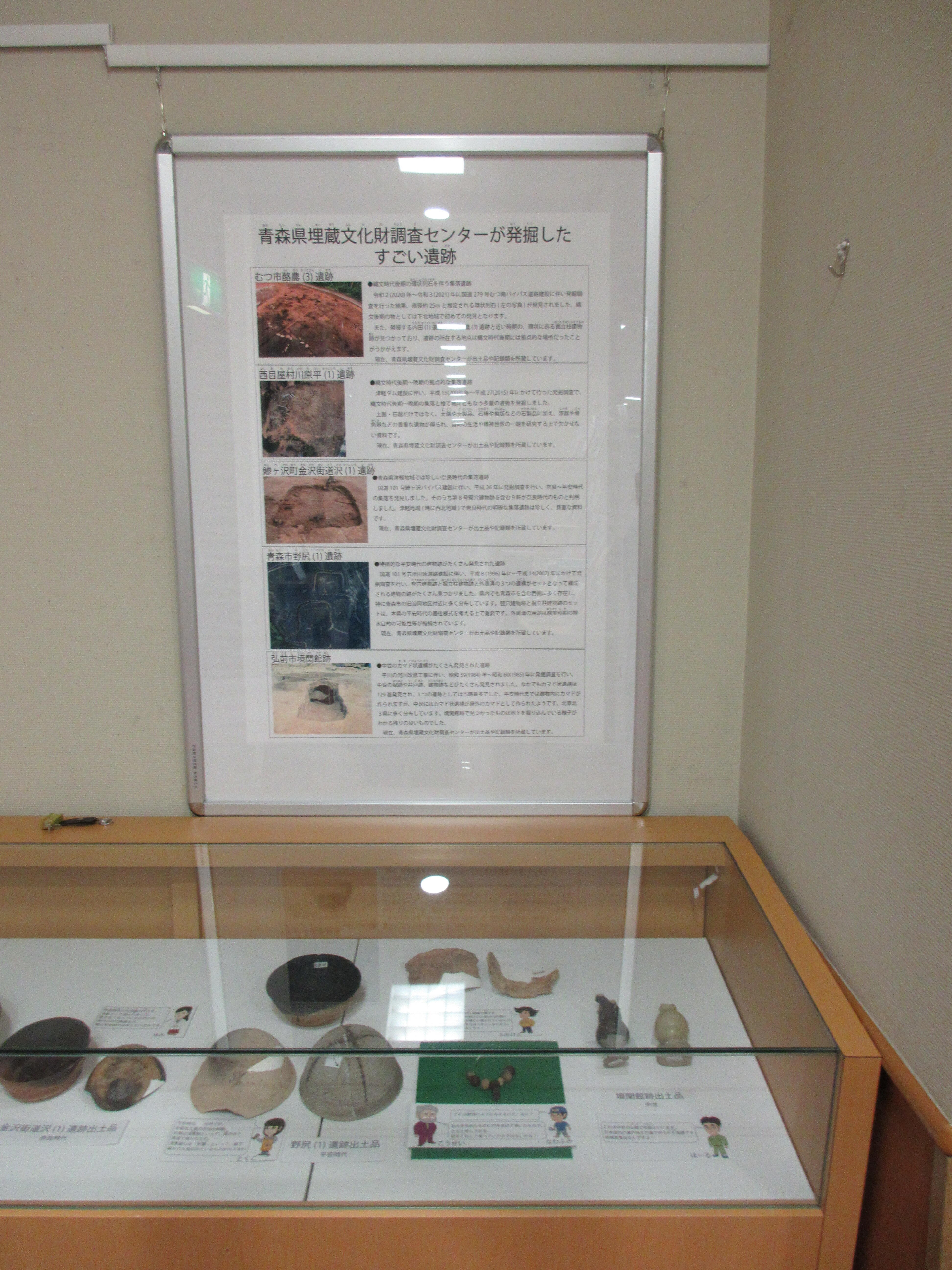 パネルと特別文化財や遺跡に史跡になった遺跡、重要文化財や県重宝等になった遺物を展示します。