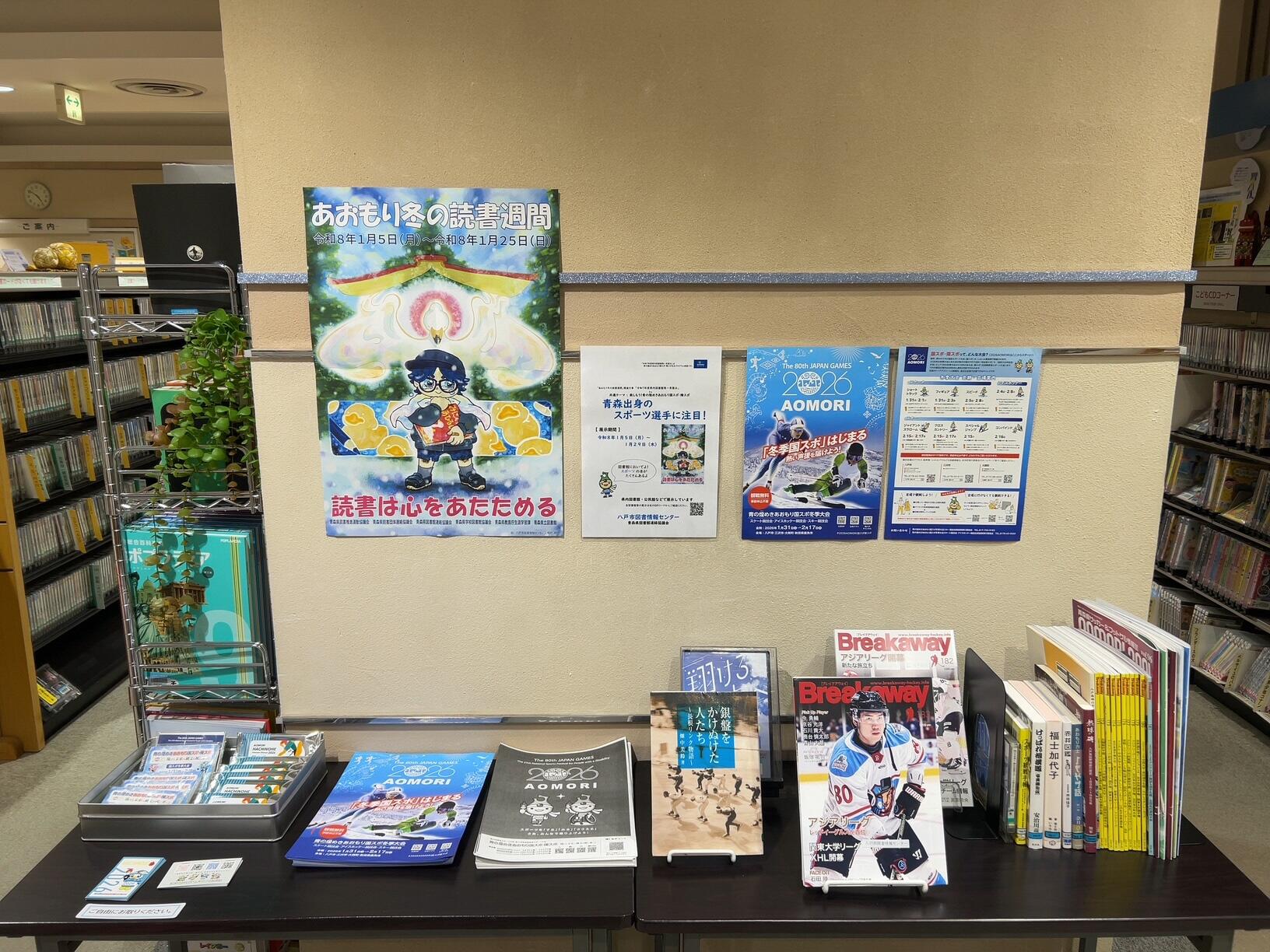 内容:青森県出身のスポーツ選手を紹介し、人物を通して競技を身近に感じ、国スポに興味を持ってもらいます。また、開催地である青森県の自然、文化、食に関する資料の展示と貸出を行います。