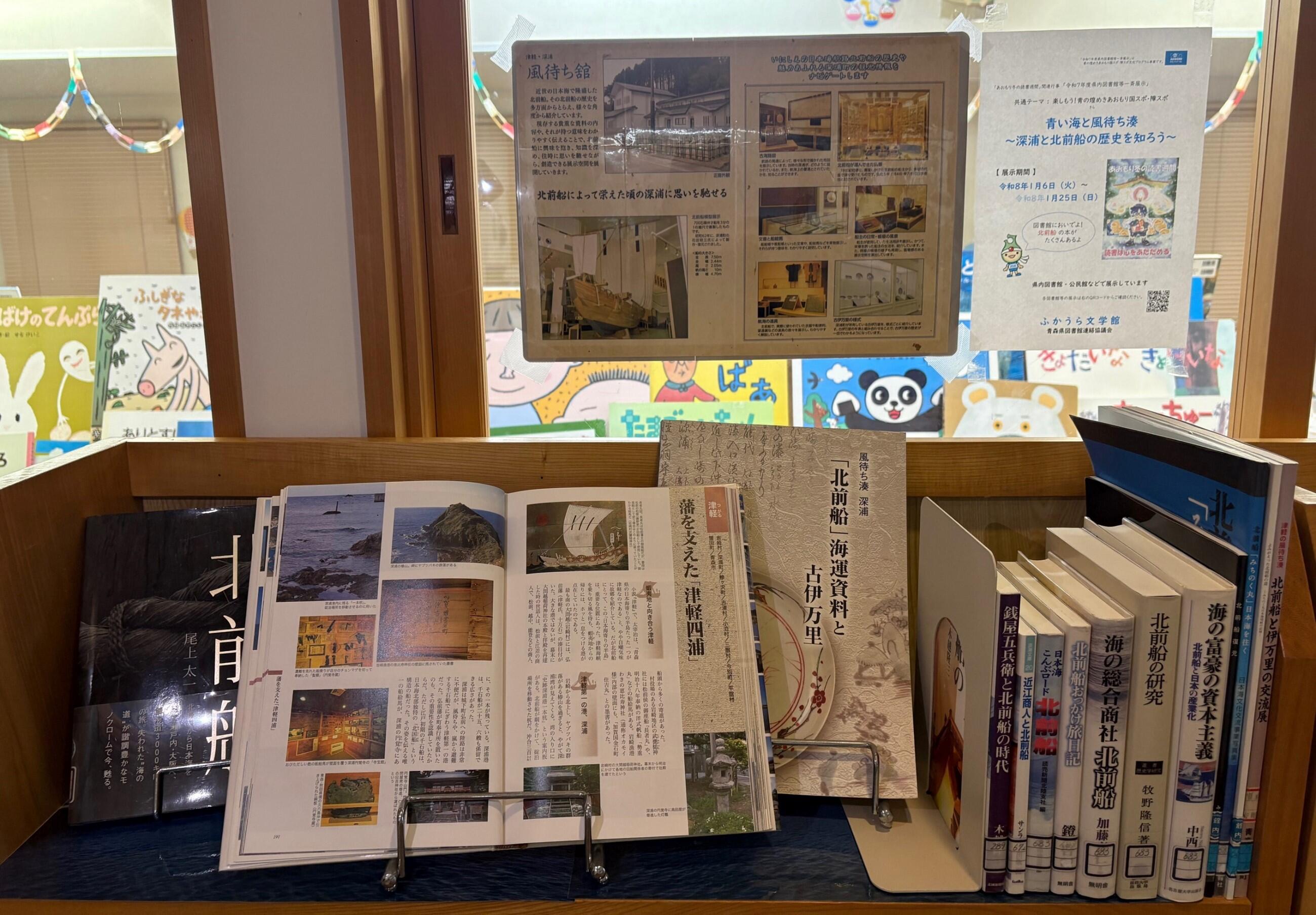 内容:深浦町は、青森県で日本遺産「北前船寄港地」に認定されている3町のひとつで、津軽地方最大の風待ち湊として栄えた港町です。本展示では、北前船に関する資料を展示し、深浦町の文化や北前船の歴史を紹介します。また、北前船の模型や船絵馬などを展示する町の資料館「風待ち館」への来館も呼びかけます。