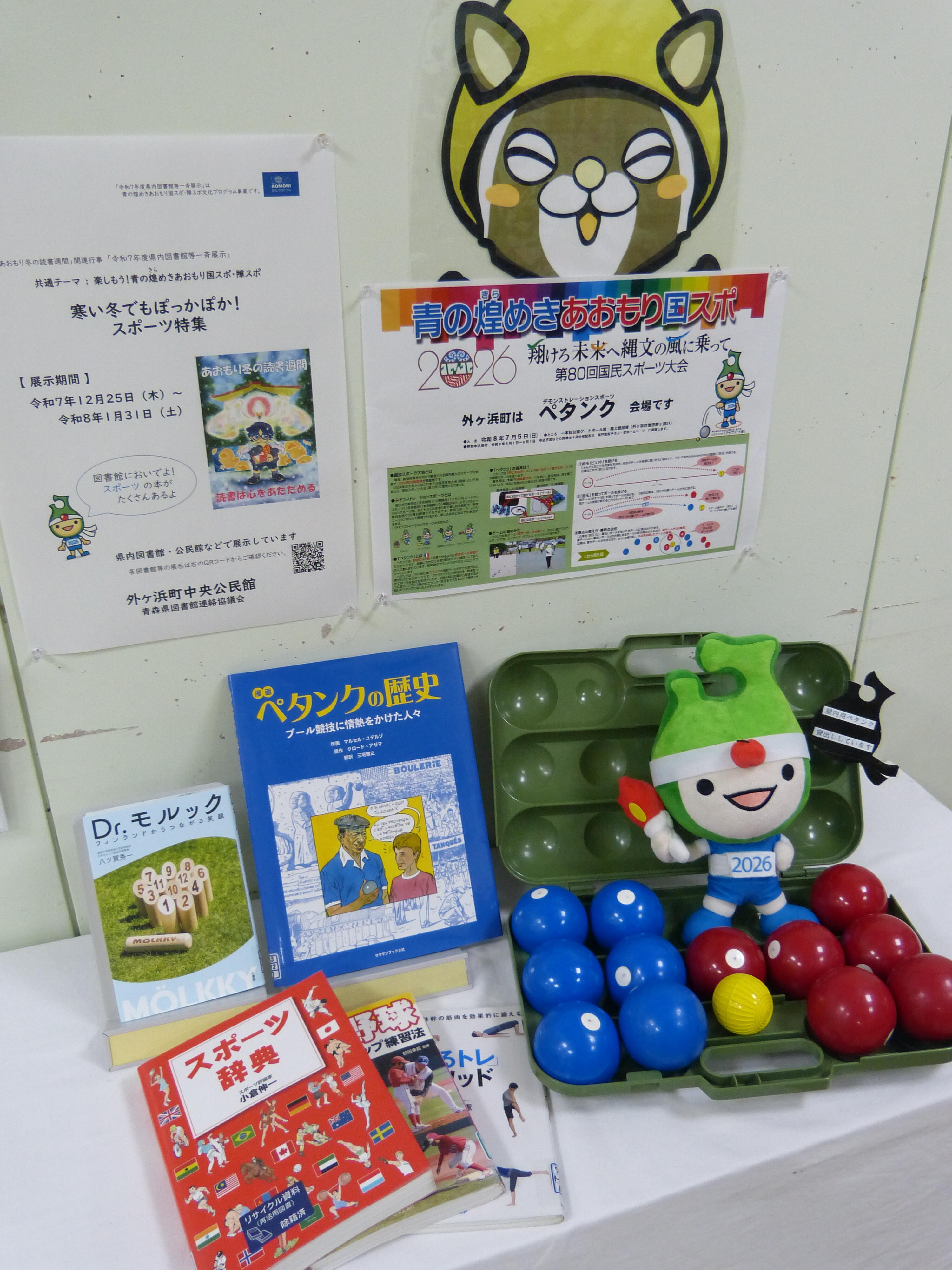 内容:外ヶ浜町で開催予定のペタンク競技をメインにスポーツ関連の図書を展示・貸出します。