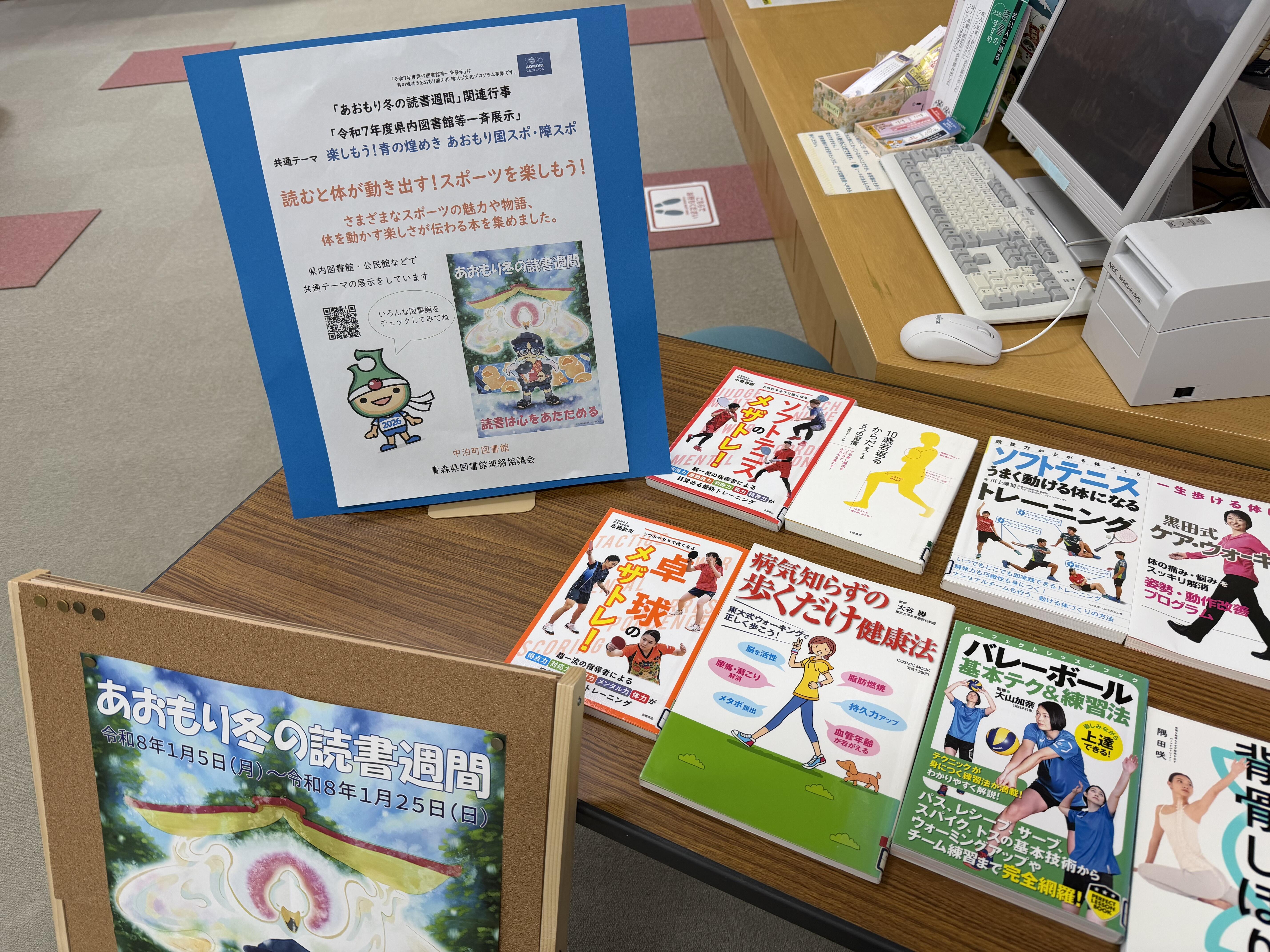 青森県図書館連絡協議会(事務局:県立図書館)では、あおもり冬の読書週間(令和8年1月5日~1月25日)に合わせ、県立図書館、県内各市町村立図書館・公民館などで「楽しもう!青の煌めきあおもり国スポ・障スポ」を共通テーマに、スポーツや地域の魅力を発信する図書の展示を行います。