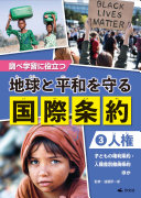 国と国、国と国際機関との間で約束を結んで協力し合う「国際条約」について解説。3は、「世界人権宣言」「子どもの権利条約」など、差別をなくし、だれもが人間らしく生きられるよう支援する国際条約を紹介する。